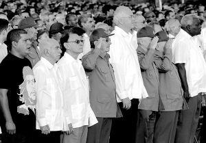 7月26日,古巴国务委员会主席劳尔·卡斯特罗(前排左四)在圣克拉拉市出席古巴“七·二六”起义57周年纪念庆典。当日,近10万古巴民众聚集在圣克拉拉市的切·格瓦拉墓前,纪念菲德尔·卡斯特罗率古巴青年攻打蒙卡达兵营57周年。 新华社发