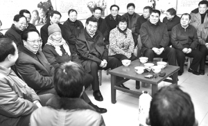在扶沟县二十里店村,回良玉到村民刘焕枝、刘爱梅家嘘寒问暖,聊生产,话家常,随后在村文化大院与村干部群众座谈。