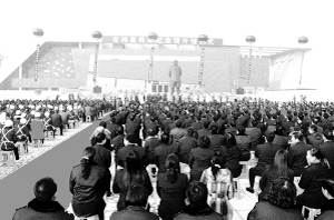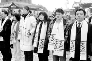 | 2009年,淮阳朝祖会期间,奥运冠军来到淮阳。图为中共淮阳县委书记、县长任连军(右一)与奥运冠军(从右向左依次)陆春龙、郭文珺、陈中、高敏等参加祭拜仪式。