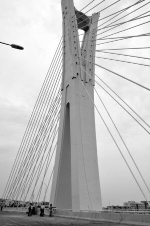 大庆路桥是连接沙颍河两岸的重要交通通道,自1980年建成以来,为方便人民生产生活和服务社会经济发展作出了巨大贡献。由于长期超负荷运行,2008年6月,桥身出现严重安全隐患,经有关部门鉴定,确定为危桥,禁止通行,新桥建设随之提上市委、市政府重要工作日程。当年7月,市政府将沙颍河大庆路桥纳入与中建七局合作共建的“四桥一路三馆”项目;11月份,新的沙颍河大庆路桥正式开工建设。历时一年半,克服种种困难,大桥于2010年7月2日正式建成通车。据了解,沙颍河大庆路桥为独塔单索面斜拉桥,工程全长297米,主桥宽35.5米,主塔高55.83米,双向四车道,限载40吨。