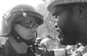 反对新移民法民众在菲尼克斯抗议示威 7月29日,在美国亚利桑那州菲尼克斯市中心,示威者与警察对峙。当日,数百人在菲尼克斯市中心举行抗议示威活动,反对亚利桑那州新移民法(SB1070)实施并呼吁完全废除这一法案。 新华社记者 戚恒 摄
