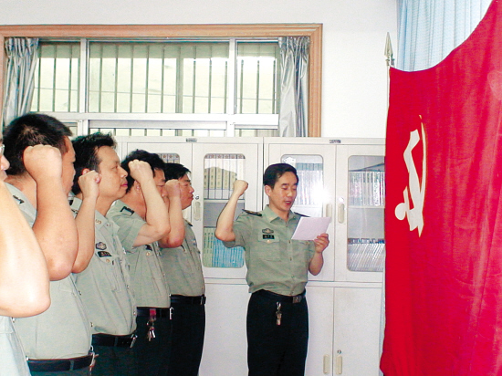 “八一”前夕,西华县人武部组织官兵重温军人誓词,激励引导官兵牢记军人使命,增强奉献意识,努力为国防建设作贡献。图为该部官兵面对党旗集体朗读军人誓词。(李自强摄)