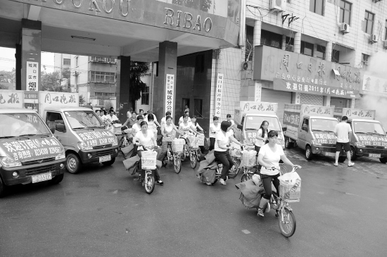 昨日,《周口晚报》举行2011年征订宣传活动。为真情回报广大读者对《周口晚报》的支持和厚爱,报社出台了一系列优惠征订政策。目前,《周口晚报》发行量较往年有了明显提升,广告量连年攀升,社会影响力、公信力、美誉度与日俱增。(记者 李寒 摄)