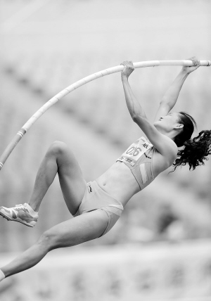 8月8日,陕西选手李彩霞在比赛中。当日,在济南奥林匹克体育中心进行的2010年全国田径锦标赛暨亚运会选拔赛女子撑杆跳高决赛中,李彩霞以4米45的成绩夺得冠军。 新华社记者 范长国 摄