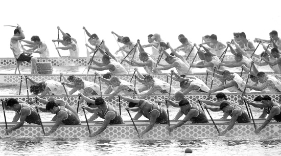 8月22日,参赛队伍在男子500米预赛中。 当日,2010年中国水上运动会龙舟比赛在山东省日照市进行了第二天的比赛,来自重庆、浙江、江苏等地的17支代表队参加了比赛。以往龙舟赛多是在内陆湖泊举行,此次比赛场地设在紧邻大海的奥林匹克水上公园,海滨龙舟赛给参赛者和观众带来了全新的感受。 新华社记者 王鹏 摄