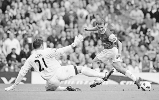 8月21日,阿森纳队球员威尔谢尔(右)在布莱克浦队门前制造险情。 当日,在2010-2011赛季英超联赛第二轮比赛中,阿森纳队主场以6比0大胜布莱克浦队。 新华社/法新