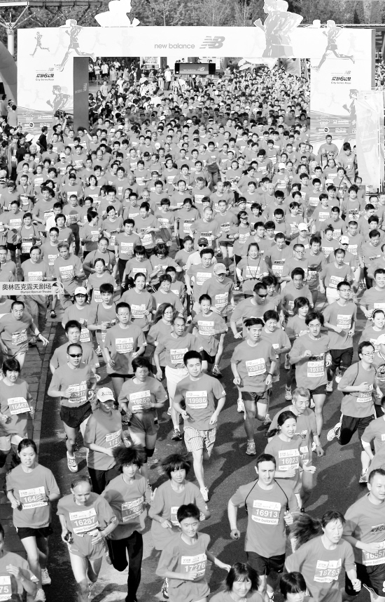 8月22日,参赛选手在公开组比赛中冲出起点。 当日,由北京市体育局主办的北京奥运城市体育文化节全民健身系列活动——2010新百伦“爱跑6公里”城市系列赛(北京站)的比赛在北京奥林匹克森林公园开赛。来自北京及天津等周边城市的近4000名市民参加了公开组和团体组两个组别的比赛。 新华社记者 陈晓伟 摄