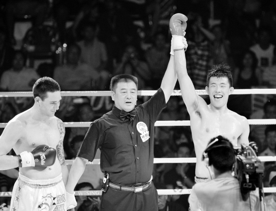 8月21日,中国选手郭强(右一)战胜澳大利亚选手阿当·得瑞,并晋级WCK次重量级洲际冠军。 当日,2010年国际职业搏击拳王争霸赛在海口市体育馆举行。来自9个国家和地区的14名选手展开激烈角逐,最终决出3条拳王金腰带。 新华社记者 郭程 摄