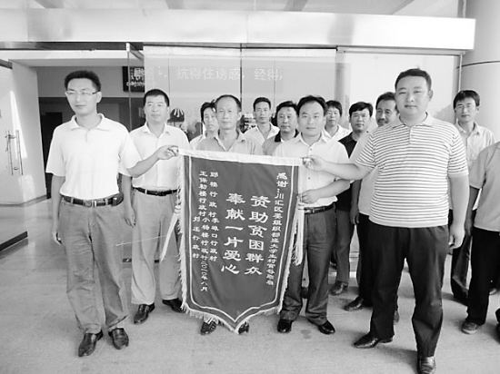 李埠口乡大学生村干部谷顺启常年帮扶全乡33户困难群众,并在收入不高的情况下,拿出2000元钱支助贫困大学生,受到村民称赞。图为该乡5个行政村的代表到区委组织部送锦旗,感谢组织部门为他们选配了一位好村干部。(杨玉洁 范胜男 摄)
