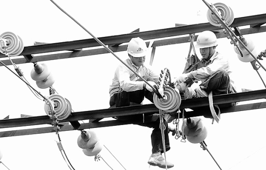 8月15日,郸城县电业局两名职工在县城外环对电力线路进行改造,确保城乡居民正常供电。(刘兴刚 摄)