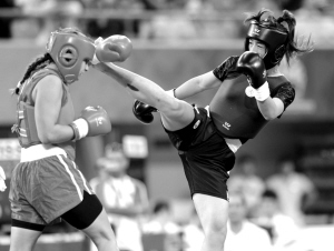 8月29日,中国选手鄂美蝶(右)在比赛中。当日,在2010年北京首届世界武搏运动会武术散手女子52公斤级决赛中,中国选手鄂美蝶以2比0战胜土耳其选手艾谢居尔·贝利万,获得冠军。 新华社记者 罗晓光 摄