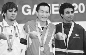 8月29日,李海明(中)与第二、三名选手在领奖台上合影。当日,在2010年北京首届世界武搏运动会武术散手男子56公斤级决赛中,中国选手李海明以2比0战胜俄罗斯选手赛特·凯鲁拉夫,获得冠军。