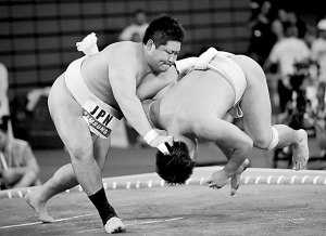 8月29日,日本选手吉田竟夫(左)在男子无差别级比赛中将对手摔倒。当日,2010年北京首届世界武搏运动会相扑比赛全部结束。