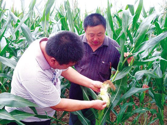 扶沟县技术人员到练寺镇林场为示范户进行技术指导,指导玉米中后期管理技术,为今年的秋粮丰收打下坚实的基础。(陈奎 摄)