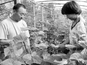 商水县谭庄镇侯庄村群众在为晚秋黄瓜施肥。该县通过远程教育开展农业技术讲座,引导群众发展反季节蔬菜,促进了群众增收。(吕耀光 马建国 摄)