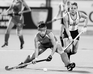 9月4日,中国队球员李爽(左)与阿根廷队球员罗德里格斯在比赛中拼抢。当日,在阿根廷罗萨里奥进行的2010年女子曲棍球世界杯B组第四轮比赛中,中国队以0比2负于阿根廷队。 新华社发(亚历杭德罗·亚丘摄)
