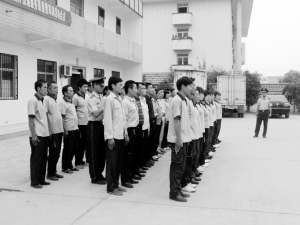 武警教官在训练投递员的站姿。为提高投递员的纪律观念,强化他们的毅力、耐力和执行力训练,为即将开始的2011年报刊征订做准备,9月5日至7日,郸城县邮政局请来武警教官,对全局48名投递员进行为期3天的军训,收到了良好效果。(王中钦 摄)