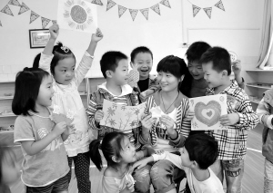 昨日,市实验幼儿园苹果班的孩子们用蜡笔画、折纸自制贺卡送给老师,表达对老师的节日祝福,迎接教师节的到来。(记者 王映 摄)