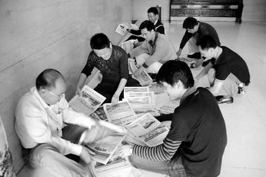 9月10日下午1时,为了把房车联展的有关信息及时传递给市民,本报工作人员在展会附近席地而坐,分拣当天加印的1万份《周口晚报》,准备在展会上分发给参展商户和前来参观的市民。 (记者 李明星 摄)