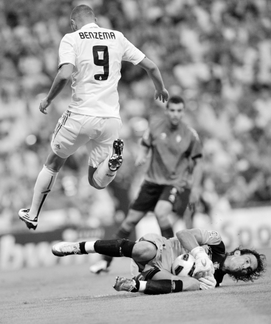 9月11日,皇家马德里队球员本泽马(上)的进攻被对方守门员截断。当日,在2010-2011赛季西班牙足球甲级联赛第二轮比赛中,皇家马德里队主场以1比0战胜奥萨苏纳队。 新华社记者 陈海通 摄