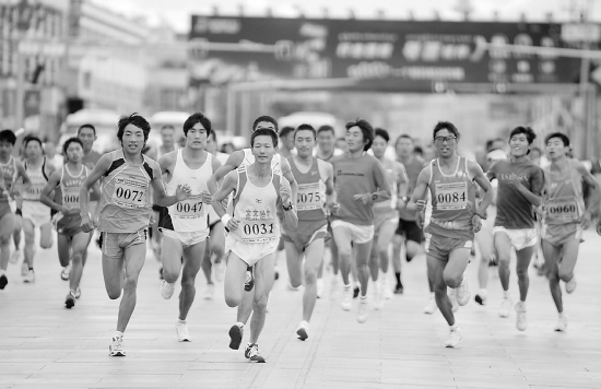 9月12日,选手们在比赛中。当日,第五届拉萨国际半程马拉松挑战赛在海拔3670米的高原古城拉萨举行。 新华社记者 普布扎西 摄