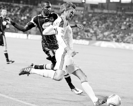 9月11日,洛杉矶银河队中场球员贝克汉姆(前)在比赛中射门。当日,美国足球职业大联盟开战,效力洛杉矶银河队的贝克汉姆披挂上阵,这是小贝继今年3月14日左脚跟腱断裂后,时隔180天重回赛场。最终洛杉矶银河队主场以3比1战胜哥伦布水手队。 新华社/路透