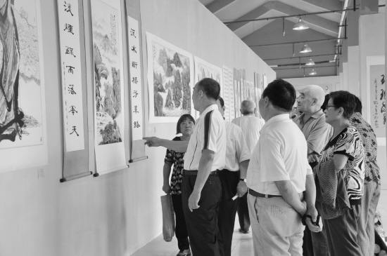 9月16日,由区委宣传部和区文化局联合举办的川汇区迎国庆书画作品展在关帝上城举行。图为书画爱好者在欣赏展出作品。 杨玉洁 赵 娟 摄