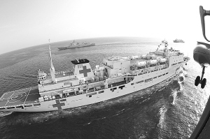 9月16日,中国“和平方舟”号医院船(前)在亚丁湾与“兰州”号导弹驱逐舰和“微山湖”号综合补给舰组成的编队会合。当日,经过连续16天5880海里的远航,驶入亚丁湾的“和平方舟”号医院船与海军第六批护航编队会合。“和平方舟”号医院船8月31日从舟山起航,前往亚丁湾海域及吉布提、肯尼亚、坦桑尼亚、塞舌尔、孟加拉国等亚非五国执行“和谐使命—2010”任务。 新华社记者 查春明 摄