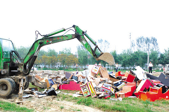 9月16日,在鹿邑县法院附近,350余台赌博机被挖掘机碾成了碎片,围观群众纷纷拍手称好。这是鹿邑县公安局对“黄赌毒”集中进行专项整治的成果。 郁发顺 李明 摄