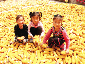 为抓好秋粮生产,商水县组织农技人员进田间开展科技服务,取得了玉米亩产超千斤的好收成。 图为该县大武乡三名儿童高兴地挑选大棒玉米爱不释手。