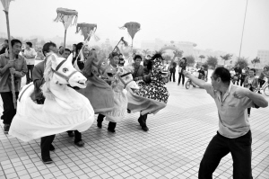 当日上午9时许,比赛正式开始,参赛队员有的舞狮子、有的吹唢呐、有的跑旱船、有的舞龙,精湛的技艺吸引了众多群众观看。在广场西南角一个不大的空地上,河南省非物质文化遗产传承人、布袋戏表演艺人吴培中老人正在给围观群众表演布袋偶传统剧目《王小打柴》,精彩的表演、滑稽的台词不时激起围观群众阵阵喝彩。