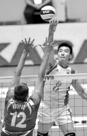 9月25日,中国队球员崔建军(右)在比赛中进攻。当日,在意大利都灵举行的2010年世界男排锦标赛小组赛中,中国队以0比3不敌保加利亚队。 新华社记者 陈海通 摄