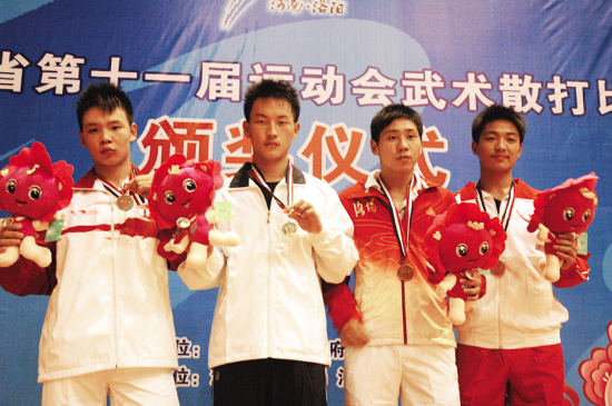 在河南省第十一届运动会的最后一个项目——武术散打比赛中,我市代表队获得两枚金牌1枚银牌。图为男子75公斤级冠军马浩男(左二)在领奖台上。(记者 李伟 摄)