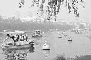 图②五颜六色的小船荡漾在公园湖心里,成为一道靓丽的风景。