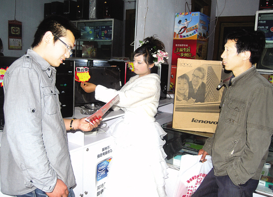 ▲如今,购买电脑成了农村青年新婚的新时尚。图为国庆期间,太康县转楼乡一农民正在为将要出嫁的女儿选购电脑。 (徐伟 徐上 摄)