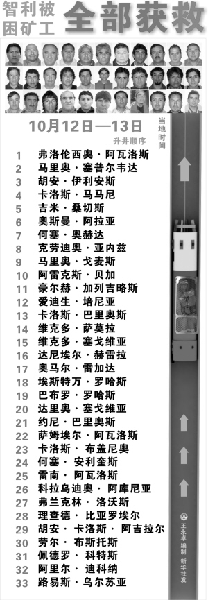 8月5日,位于智利北部阿塔卡马沙漠中的圣何塞铜矿发生塌方事故,导致33名矿工被困700米深井下。经过长达数十天的努力,救援人员终于挖通了救援通道,并于当地时间10月12日晚正式开始最后阶段的救援行动。经过一天的救援,最后一名被困矿工路易斯·乌尔苏亚在当地时间13日晚成功升井获救。救援进展超过预期,救援时间比原计划大幅缩短。