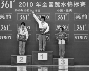 10月17日,获得女子10米跳台决赛前三名的选手在领奖台上。当日,在2010全国跳水锦标赛女子10米跳台决赛中,江苏选手陈若琳夺得冠军,四川选手胡亚丹获得亚军,辽宁选手柯婷婷获得第三名。