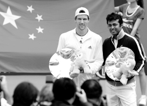 10月17日,梅尔泽(左)/佩斯组合在比赛后的颁奖仪式上。当日,在上海网球大师赛男子双打决赛中,梅尔泽/佩斯组合以2比0胜费腾博格/麦考斯基组合,夺得冠军。 新华社记者 凡军 摄