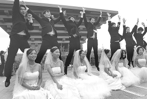 中国馆见证我们的爱情 10月22日,新人高兴地在中国馆前合影留念。当日,9对世博会工作人员以上海世博园的中国馆为背景举行了集体婚礼。世博会期间,他们一直在世博园区辛勤工作,有的还为了世博会的工作推迟了婚期。在世博会即将闭幕之际,他们终于喜结连理。新华社发