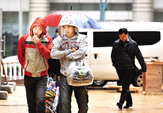 受北方冷空气影响,大风裹着秋雨使我市气温大幅下降,街上的行人穿上了厚厚的秋装。(陈诚 摄)