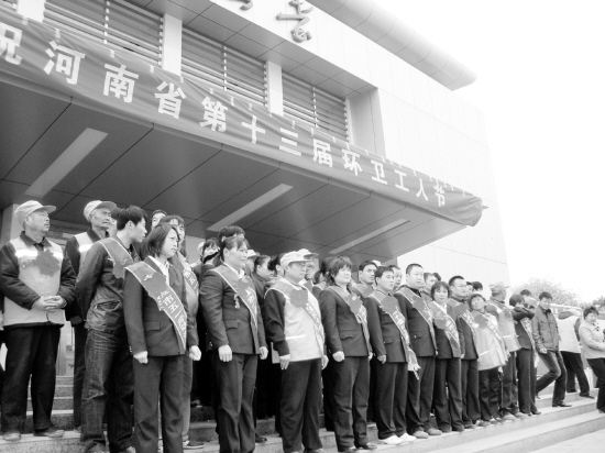 10月26日是河南省第十三届环卫工人节。项城市委、市政府举行庆祝大会,表彰该市“十佳”环卫标兵、“五一”劳动奖章获得者和先进工作者,并向全体环卫工人致以节日的祝贺和慰问。 (记者 杨光林 摄)