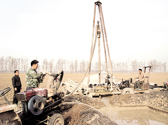 连日来,商水县以开展创先争优活动为契机,组织党员干部和群众掀起了以修路、打井、修桥为主的农田水利基本建设热潮。图为该县袁老乡党员干部和群众一起在农田里打机井的情景。 (刘飞 张慧 摄)