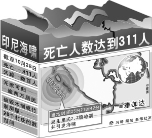 据新华社印度尼西亚北巴盖岛10月29日电 据西苏门答腊省省长和当地救灾机构29日公布的数字,该省明打威群岛海啸已造成394人死亡,312人失踪,400多人受伤。据官方估计,随着搜寻工作的进展,伤亡人数还将上升。