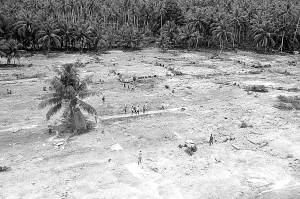 这是10月27日在印度尼西亚西苏门答腊省明打威群岛拍摄的一个村庄,这个原有几百户居民的村庄在海啸过后已变成一片废墟。