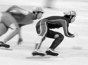 10月31日,吉林冬管中心代表队选手韩天宇(右)在男子1000米决赛中。当日,2010-2011全国短道速滑联赛第三站进入最后一天,韩天宇以1分30秒512的成绩夺得青少年组男子1000米冠军。 新华社记者 林宏摄