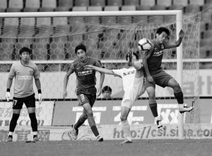 10月31日,重庆力帆队球员胡伟(右一)在比赛中门前救险。当日,2010赛季中国足球超级联赛第29轮的比赛中,重庆力帆队主场对阵长春亚泰队。