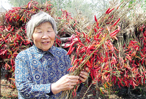 昨日上午,一位老大娘看着自家晾晒的红辣椒喜笑颜开。太康县积极引导农民种植辣椒等经济作物,力促农民增产增收。今年,该县近10万亩辣椒喜获丰收。(记者 孙安平 摄)