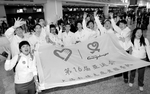 世博志愿者踏上服务亚运会征程 11月4日,赴广州参加亚运会服务的世博会志愿者在机场候机厅合影留念。当日,11名上海世博会志愿者踏上了前往广州服务第十六届广州亚运会的征程,他们将把在世博会期间积累的经验和良好的服务,呈现给观看亚运会足球、橄榄球两个项目的现场观众。 新华社记者 凡军 摄