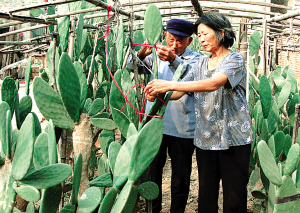 如今,栽培食用仙人掌成为太康县转楼乡李屯村农民增加收入和脱贫致富的新门路。图为该村村民王洪章夫妇在精心管理食用仙人掌。(徐伟 徐馨 摄)