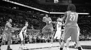 11月6日,火箭队球员布鲁克斯(左三)跳起上篮。当日,在圣安东尼奥进行的一场2010-2011赛季NBA常规赛中,休斯敦火箭队客场对阵圣安东尼奥马刺队。 新华社发